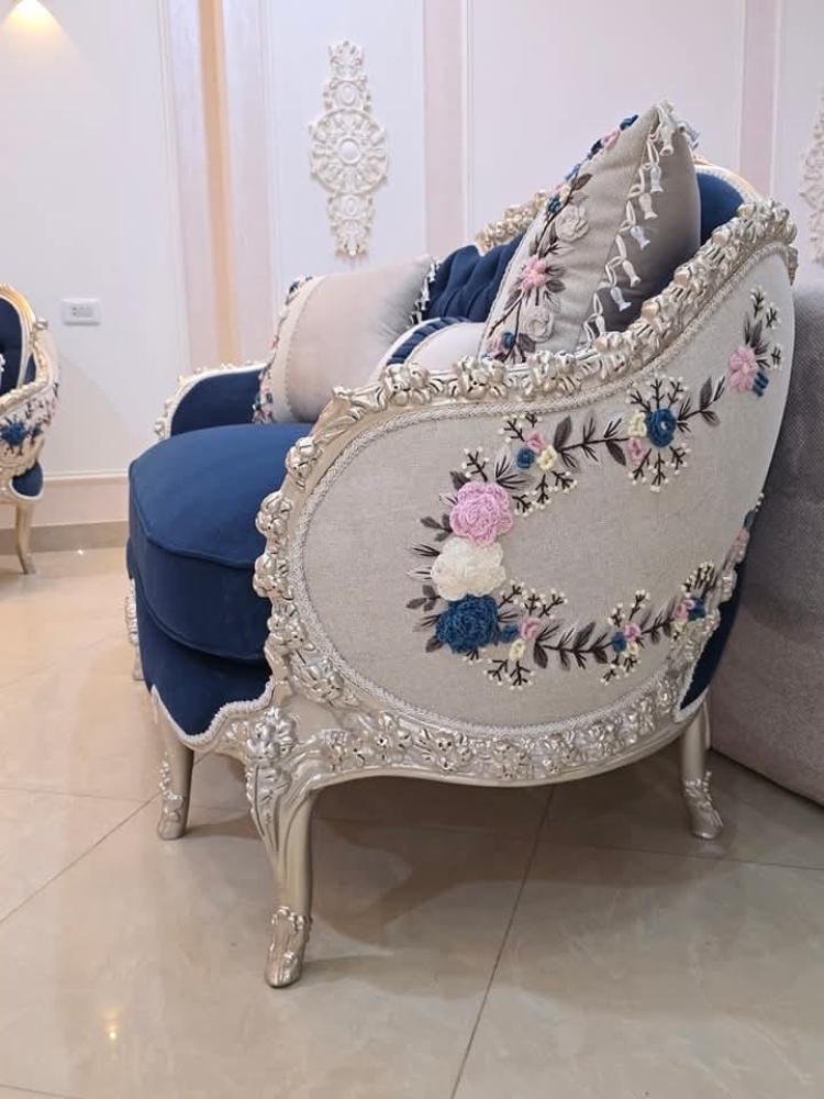 - التنجيد: قماش تركي بألوان كافيه وأزرق مع دمج قماش مشجر يضفي تنوعًا بصريًا مميزًا.